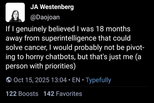 Think about all of the erotic chatbots that those oncologist phds could have created instead.