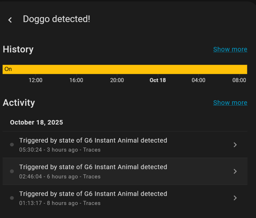 early_riser@lemmy.world to homeassistant@lemmy.worldEnglish · 2 months agoI made my Unifi camera excitedly scream 'Doggo!' every time it detects an animal. I did not account for the several minute delay for image processing and the fact we have stray cats.lemmy.worldimagemessage-square10linkfedilinkarrow-up1124arrow-down13file-text