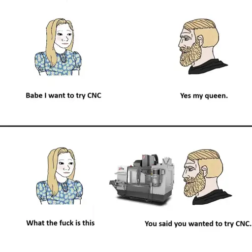 - I’m a woman and That’s what i thiught too. Is there a sexual conotation to cnc? Maybe that’s why my sex life is shit - No. It’s shit because you don’t have enough CNC hardware to attract a lover. - Makes sense. I bought a fucking 3d printer instead of investing on a cnc. I’m dumb - strap a dremel to your printer. - You now have a CNC machine - Edit: i call it “CNC with a Strap On” - lol that’s a great idea