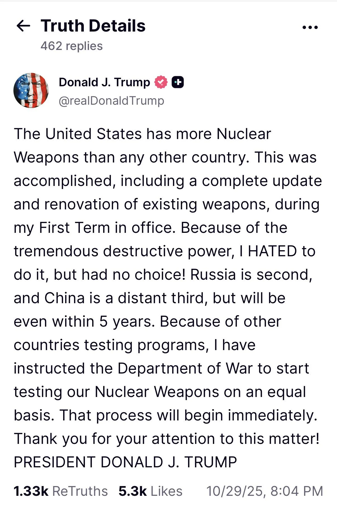 It’s also a blatant lie. Other countries are not testing nuclear weapons, they’re running simulations. We didn’t do that in the 60s because it wasn’t possible, but the US (and presumably China/Russia) literally have giant supercomputers for this purpose now.