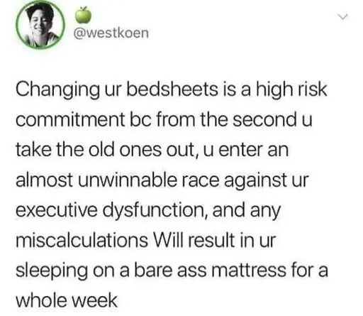 Instructions unclear; all bedsheets are now dirty and I’ve been sleeping on a bare ass mattress for a month.