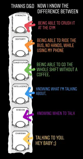 Now you can have a character that’s commanding without also being a natural liar and flirt. DND doesn’t help let you do that because the concepts are bundled together into a single stat.