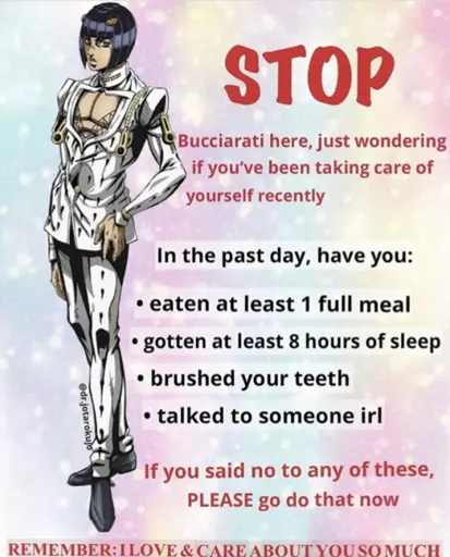 Alt text: Bucciarati stops you, asking if today you ate at least one full meal, slept eight hours, brushed your teeth, or spoke to someone in real life. If no to any of these, please go do that now. Bucciarati loves and cares about you.