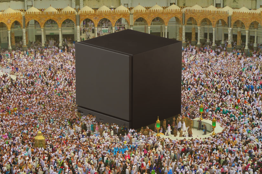 I believe that have swapped the Steam Machine in for the Kaaba at Mecca- the Islam holy site. The Kaaba is already a big black cube, so it works well.