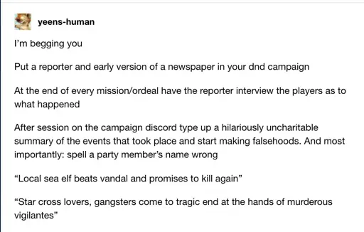 Stamets@lemmy.dbzer0.com to RPGMemes @ttrpg.network · 24 days agoEXTRA EXTRA! READ ALL ABOUT THOSE DUMB FUCKS!lemmy.dbzer0.comimagemessage-square43linkfedilinkarrow-up1603arrow-down17