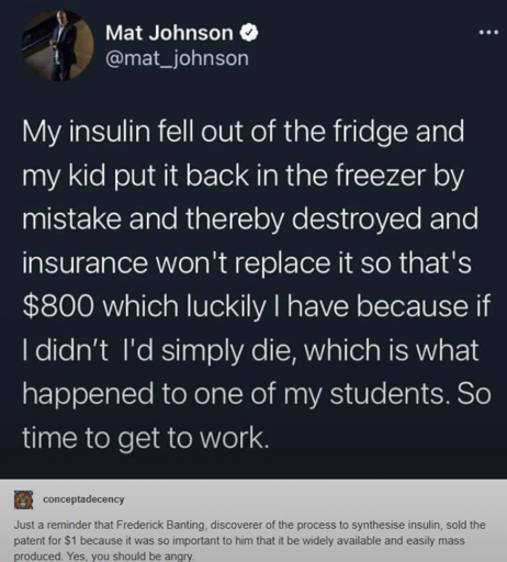 They also don’t make insulin the way that he did back then. Not justifying the price hike cause the way its made now is way cheaper than it was with the old method (which was basically grinding up animal parts to extract insulin). These fucks are just profiting off of the suffering of Americans who have literally no choice but to use their drug.