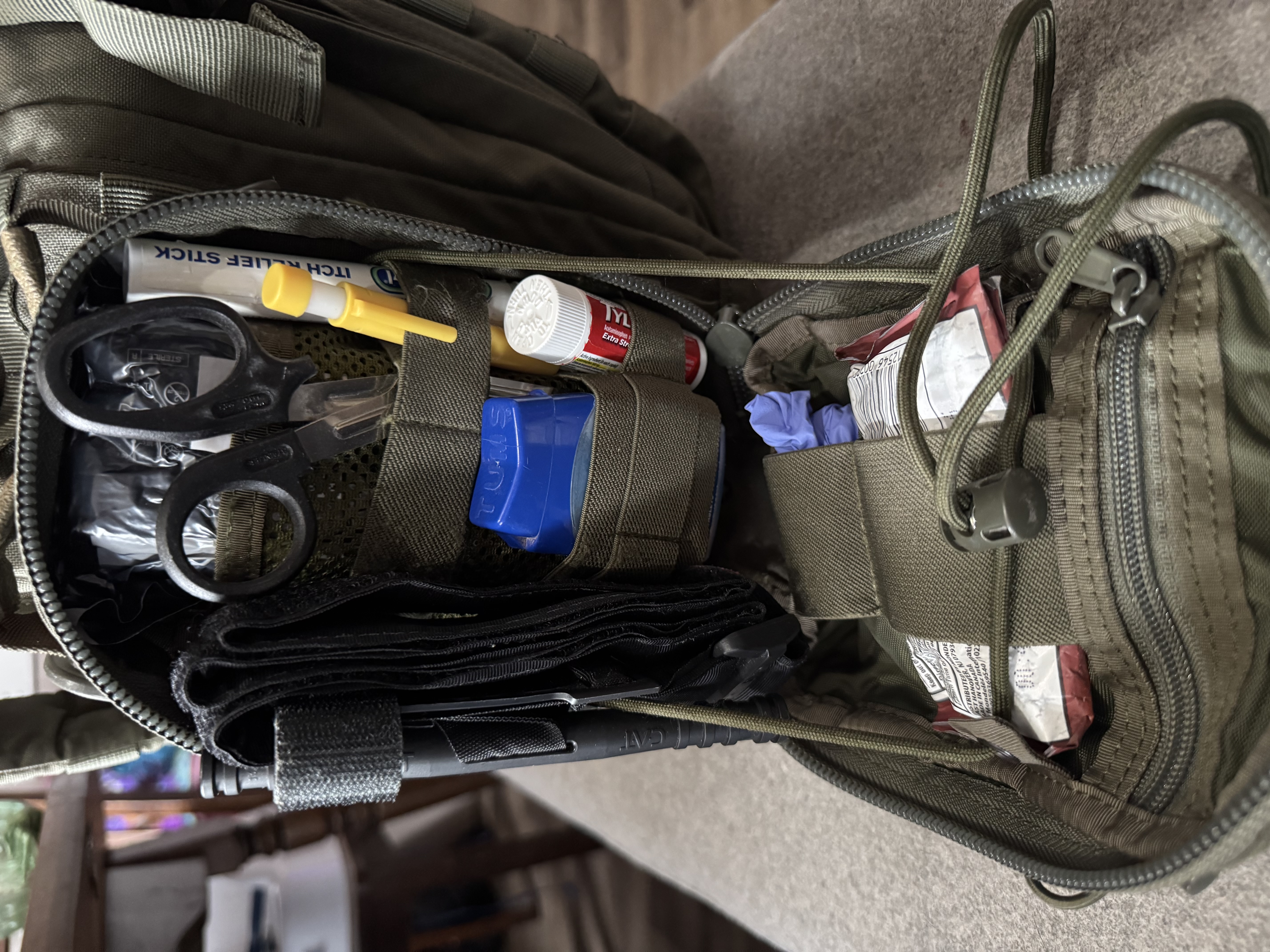 In my portable trauma kit (it’s actually a small pack with both ouch and emergency compartments), I have more gloves, a fair bit of different sized packing gauze (quick clot), a compression bandage, emergency foil blanket, chest seals, a sharpie, and mounted on the outside are trauma shears and a CAT Gen 5 tourniquet in a dedicated holster. As a bonus, I have a moldable splint in an emergency survival bag with the rest of my kit.