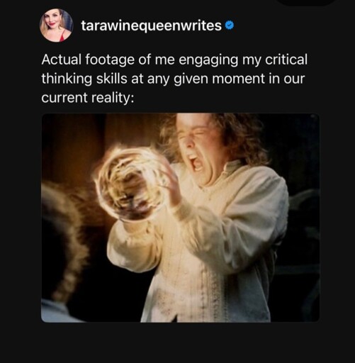 fun fact: Sauron did not create the Palantiri (btw, the word Palantir literally means “to see from afar” in Quenya, Tolkien’s high-elven language, the same etymology as the English word “television”), but he was able to gain control of the stones and influence the thoughts of others who looked into them by showing them visions of only the things he wanted them to see, which would bring those who were susceptible over to his side, or for those who were less susceptible, drive them to hopelessness and despair (this is what happened to Denethor, the Steward of Gondor; the movies decided to remove that plot point and make him look like an asshole for no reason). anyway, just a random fun fact about a fictional world, definitely no real modern relevance to powerful malicious actors gaining control of “television” or other means of rapid communication to bend the thoughts of others to their will