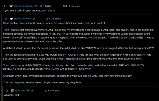 Oh yeah similar dreams have happened to me where I was peeing but the need to pee didn’t subside while I was going. So I just spent an enternity peeing in the dream without getting any relief.