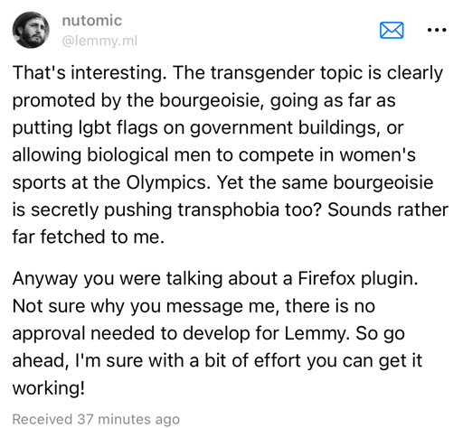 arrow-up149arrow-down1image[Transphobia Warning] Nutomic’s Stance on Transgender Peoplepinlemmy.caPugJesus@lemmy.world to MeanwhileOnGrad@sh.itjust.worksEnglish · 1 year agomessage-square66linkfedilinkcross-posted to: fediverse@lemmy.worldfediverselore@lemmy.ca
