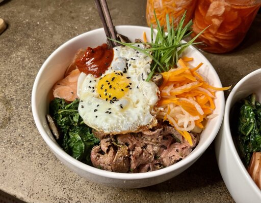 Bibimbap made on a bed of jasmine rice, homemade pickled daikon & carrot, sautéed sesame soy bok chet and bok choi greens from the garden, home pickled radish, thinly sliced tenderloin marinated in a homemade ponzu sauce, home fermented hot pink kimchi, farm fresh fried egg with black sesame seeds, and our house aged fermented gochujang.