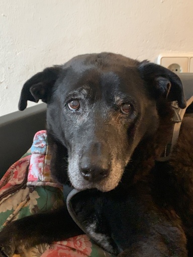 Ours is from Murcia Spain, and presumably a Labrador and Pastor mallorquin mix; the latter recognizable by the white spot on the chest , which yours seems to missing. And he barks loudly when the doorbell rings. Ours also loved sleeping on his back.