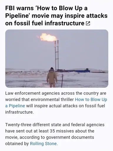 minus-squareidegenszavak@sh.itjust.workslinkfedilinkarrow-up40·1 month agoThe movie is from 2022: https://en.m.wikipedia.org/wiki/How_to_Blow_Up_a_Pipeline_(film)