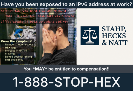 arrow-up1478arrow-down1imageHave you been exposed to an IPv6 address at work?lemmy.worldqaz@lemmy.world to Programmer Humor@programming.devEnglish · 3 months agomessage-square45linkfedilink