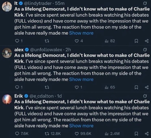 this was also all over reddit posts, to with the exact same messaging,"a democrat that supports charlie kirk.
