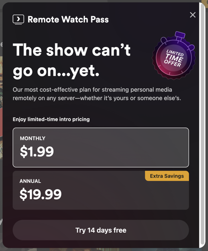I know Plex is a business that has to make money, but if I hadn’t bought a lifetime pass for $50 a decade ago, I’d have dropped them at this point.
