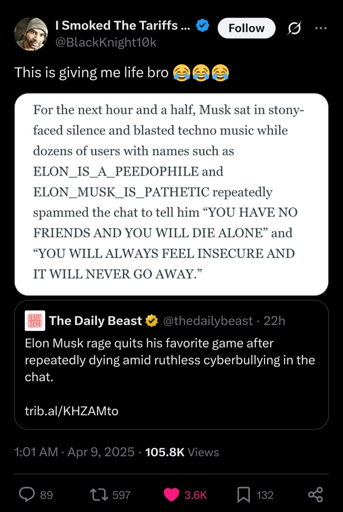 And if he actually just wanted to play a video game for fun, he would just do it anonymously. Make a new account, don’t call it Elon_is_the_best, don’t stream it.