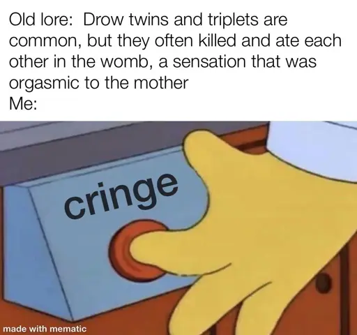 Pretty much everything about drow lore is mega yikes tbh. It’s no surprise that PF2E was basically like “no fuck you theres no such thing as a drow, leave them in the past”