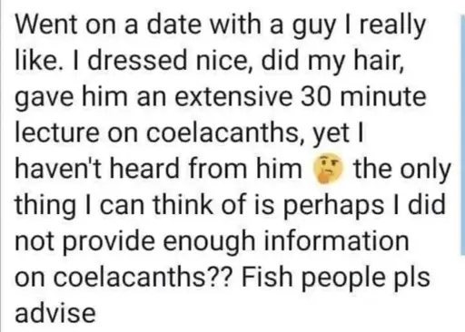 minus-squareReginald_T_Biter@lemmy.worldlinkfedilinkEnglisharrow-up3·13 days agoI coelacant live without you babes