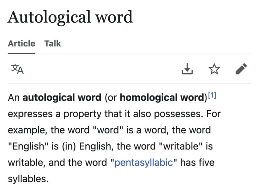 minus-squareblujan@sopuli.xyzlinkfedilinkarrow-up1·13 days agoNone, we assumed the classification was binary, but these words are called Grellingian Words