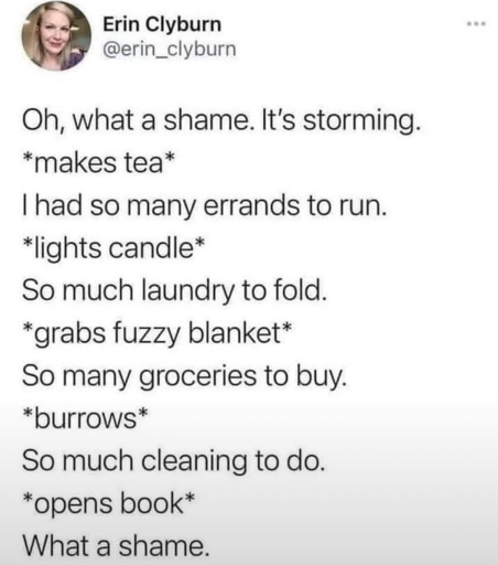 minus-squarefascicle@leminal.spacelinkfedilinkarrow-up27·11 days agoI don’t think there rain is stopping anything but it creates a want-to-snuggle-and-stay-home feeling that one cannot resist