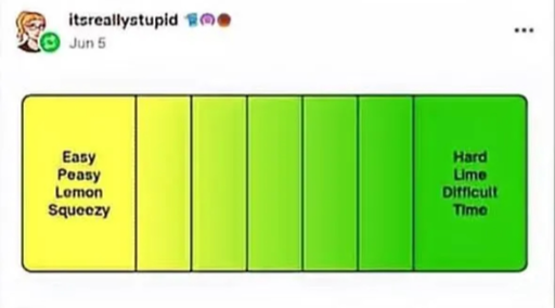 arrow-up1460arrow-down1imageThe citrus scale of difficultylemmy.dbzer0.comHootinNHollerin@lemmy.dbzer0.com to Microblog Memes@lemmy.worldEnglish · 9 days agomessage-square15linkfedilink