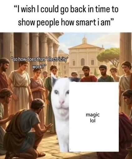 Again, getting to electricity from there is still a whole fucking chore. But hopefully you could rely on science to advance way faster from your advances than if you weren’t there.