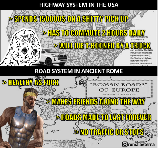 Also to add, the roman roads don’t last forever. Via Appia is in a very poor state and only the bottom most layer is still there. Contrary to pop history asphalt lasts longer than the Roman method and would have saved them a lot of maintenance.