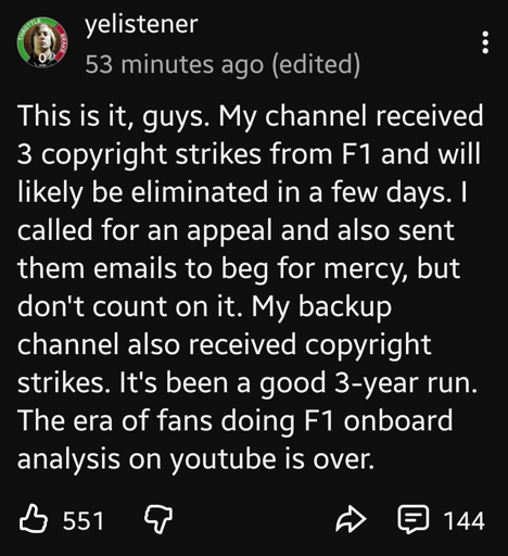 0·6 days agoI think the Vegas wet qualy with full wets randomly being used in the desert takes it for me, but yeah this was also a banger!